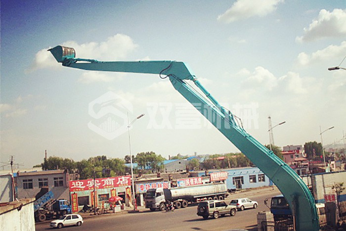 加長臂:加長臂是我們最常見,使用時間更早的大小臂加長臂,不需要伸縮缸控制。它通過大臂、小臂同時加長,配帶小挖斗,擴(kuò)大機(jī)械的工作范圍。