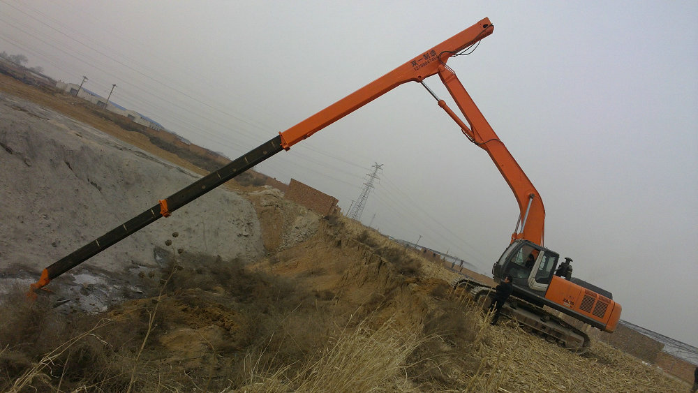 我公司生產的挖掘機加長臂利用超長型動臂和超長型斗桿,可在疏浚、護岸、坡面以及地鐵建設等受地面環境限制的工況下發揮巨大的威力。我們的技術人員任職于挖掘機械行業十余年,有豐富的制造經驗。采用先進的電腦2D、3D輔助設計系統設計,并經過設計系統進行挖掘機實際動作模擬,確保產品的準確性及可靠性,通過各類加工設備,熟練員工技能和實際應用知識和經驗,從應力分析、材質選擇、技術和工藝、設計制作等方面保證了挖掘機加長大小臂的結構強度、使用性能和質量。 挖掘機加長臂主要適用于土砂、混凝土等建筑搬運、高速公路坡面修整及河道疏通清淤工程及較深的建筑基礎、河道、深溝等土石方挖掘作業,通過在原挖掘機的基礎上安裝挖掘機加長臂,能完成標準臂無法達到的距離,使挖掘機最大限度的發揮其用途,廣泛作業于各種施工現場,使效率和安全性更高。